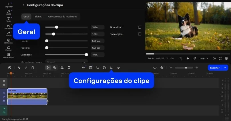 Selecione o arquivo adicionado e clique em Configurações do clipe. Na guia Geral do aumentador de volume, basta alterar a configuração de Volume para deixar o som do vídeo mais alto.