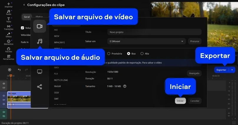 Clique no botão Exportar. Para salvar um arquivo de vídeo, selecione o formato apropriado na guia Salvar arquivo de vídeo – você pode escolher entre MP4, MOV, AVI, MKV e muitos outros formatos. Se você deseja salvar um arquivo de áudio, alterne para a guia Salvar arquivo de áudio e escolha o formato desejado (por exemplo, MP3, WAV, AAC ou FLAC). Clique em Iniciar para começar a salvar e transformar o arquivo, e conclua o processo de exportação.