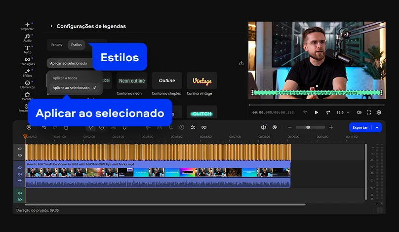 Abra a aba Estilos e selecione o design das suas legendas. Há mais de 30 estilos disponíveis para combinar perfeitamente com qualquer tipo de vídeo que você criar. O design selecionado será aplicado a todos os clipes por padrão. Se quiser definir estilos diferentes para clipes, selecione o clipe na linha do tempo e escolha Aplicar ao selecionado no menu suspenso.