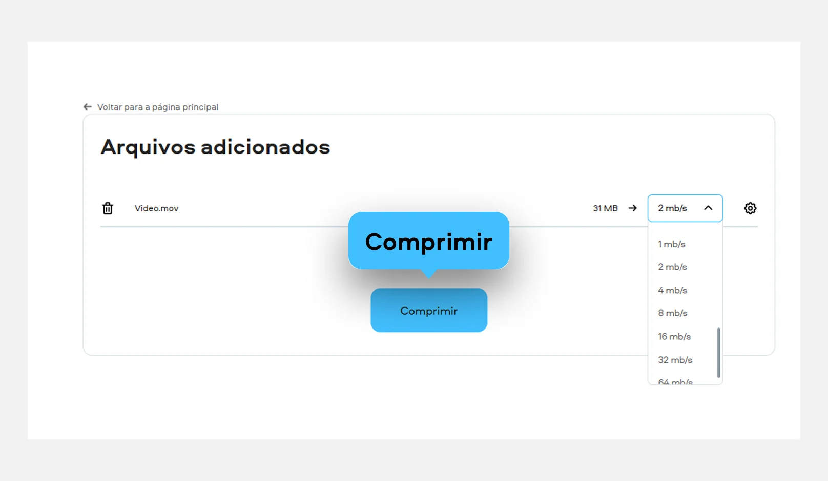Após o upload, selecione o nível de compressão de acordo com suas necessidades, por exemplo, 2 MB/s. Depois de definir esse parâmetro, pressione Comprimir.