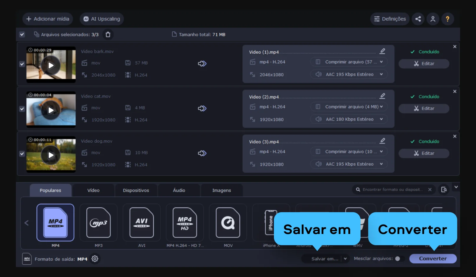 Agora, clique em Salvar em para escolher a pasta de destino e, em seguida, pressione Converter. O software aplica a compressão de forma limpa e rápida. Este método funciona muito bem para projetos maiores ou vários arquivos.