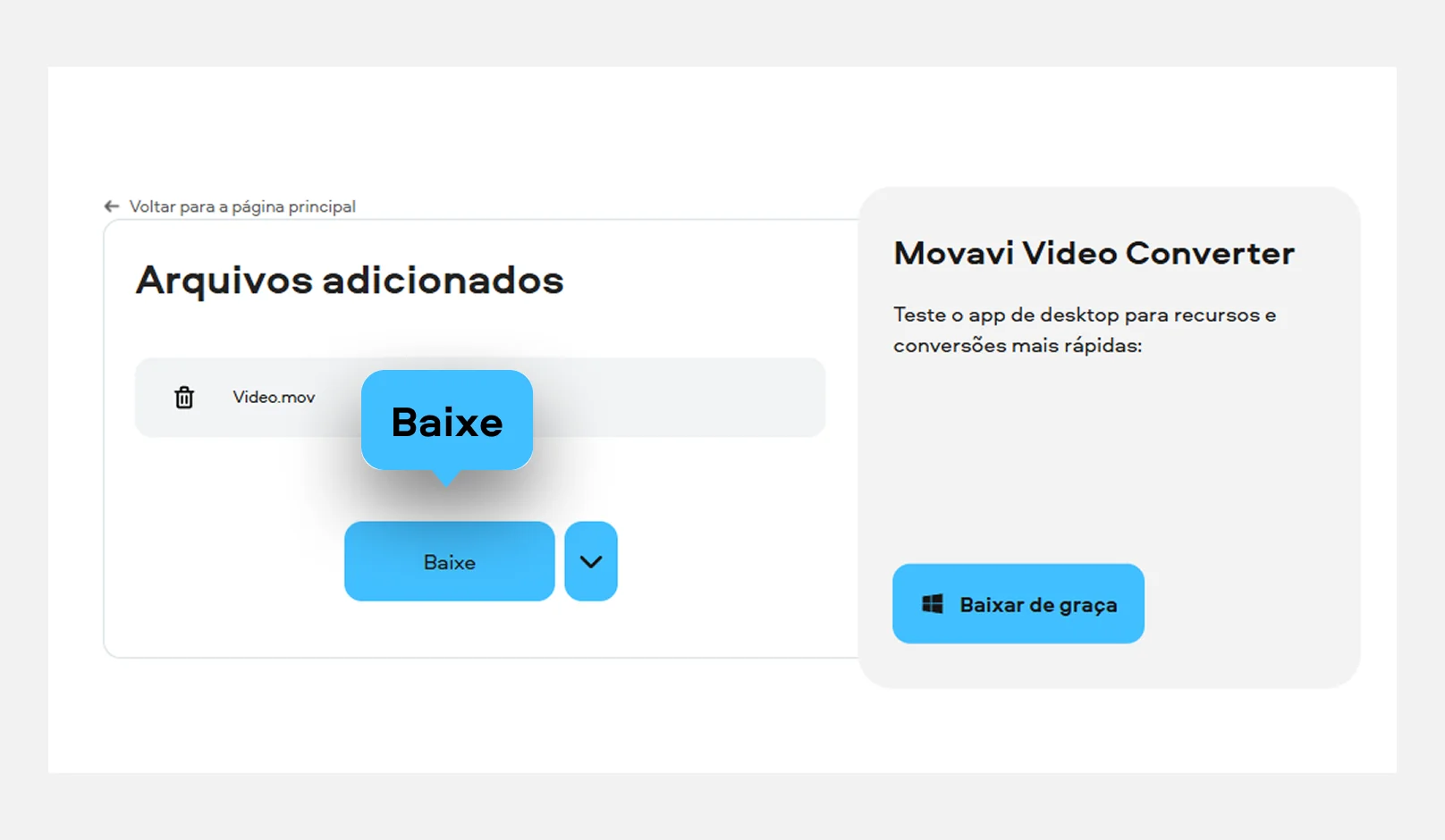 Se estiver satisfeito com o resultado, clique em Baixe. O arquivo compactado estará pronto em segundos, sem marca d’água e com qualidade preservada. É muito fácil comprimir .mov online.