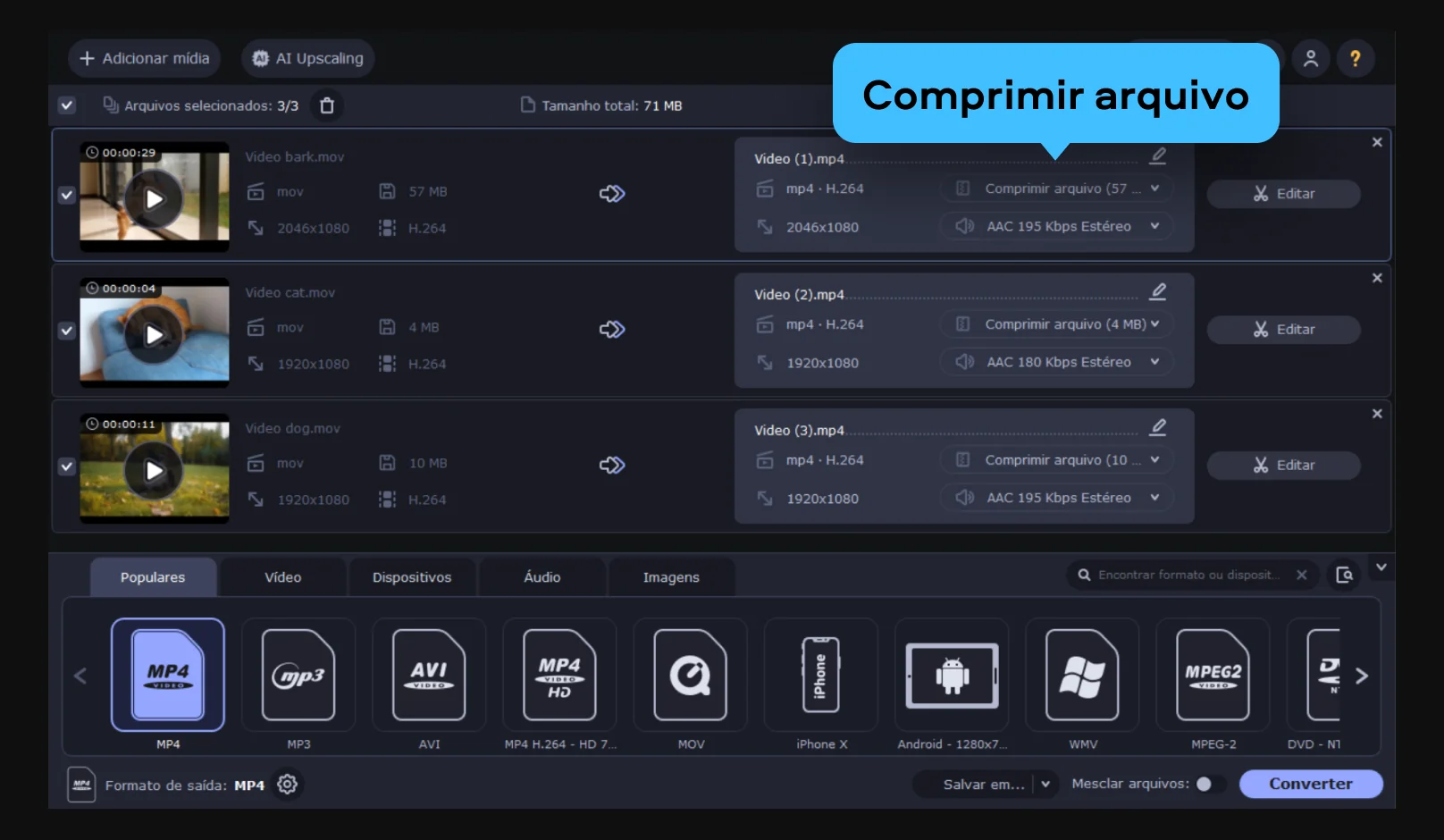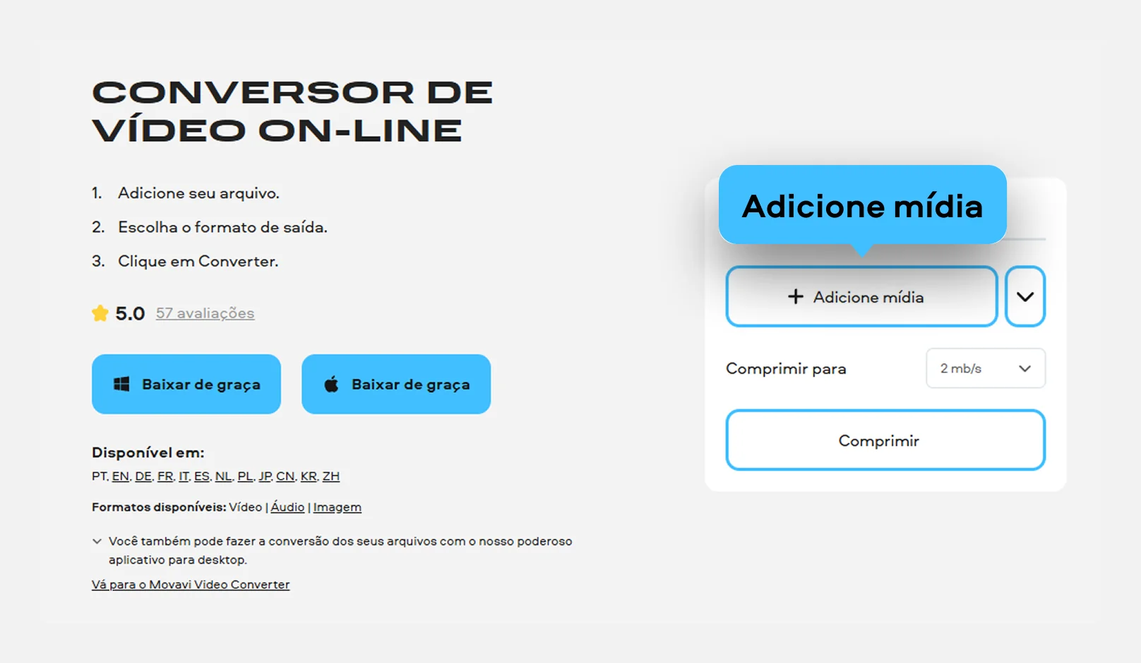 O truque é usar ferramentas confiáveis como o compressor de vídeo online Movavi ou o Movavi Video Converter. Ajuste a taxa de bits, selecione alta qualidade e o tamanho desejado. Assim, você consegue diminuir o tamanho de vídeo MOV mantendo cores e nitidez.