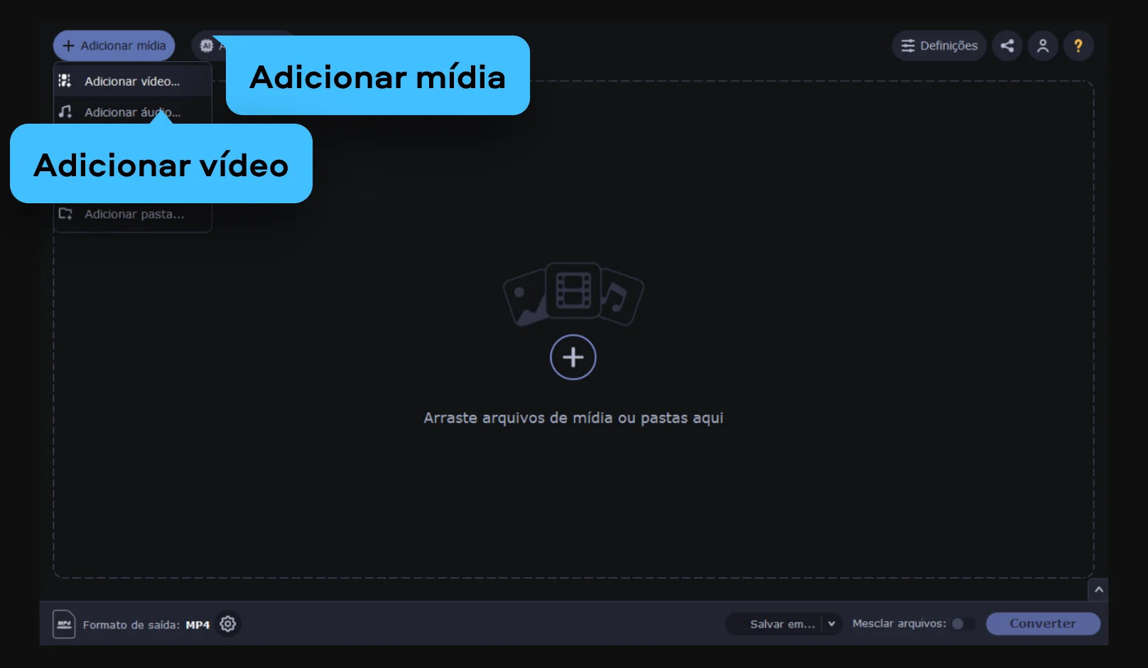 Abra o Movavi Video Converter e clique em Adicionar mídia. Em seguida, clique em Adicionar vídeo para selecionar os clipes do seu dispositivo. Selecione um ou mais arquivos MOV para compressão. Arraste os clipes para a linha do tempo se quiser organizar ou editar antes de compactar.