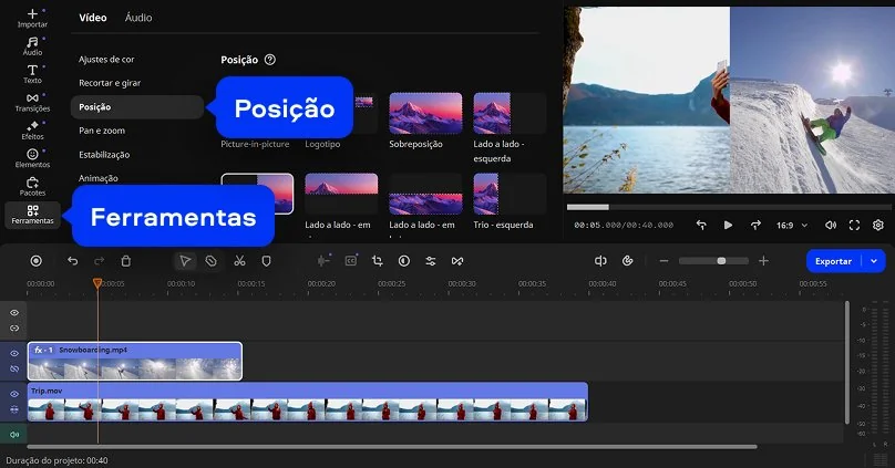 O que me chama atenção é como tudo é visual. Eu arrasto os vídeos para a timeline e, em poucos cliques, já começo a montar a composição. Isso faz toda a diferença quando a ideia é trabalhar rápido, mas ainda assim entregar algo com cara profissional. Outro ponto importante é o controle. Eu consigo posicionar cada vídeo na tela, redimensionar, alinhar e testar diferentes combinações até encontrar o layout que funciona melhor. Se precisar, também posso dividir um vídeo em partes aqui mesmo no programa: ele também possui funções para dividir um vídeo MP4. Seja para um vídeo comparativo, reação, tutorial ou conteúdo para redes sociais, a tela dividida abre possibilidades criativas que vão além do básico.