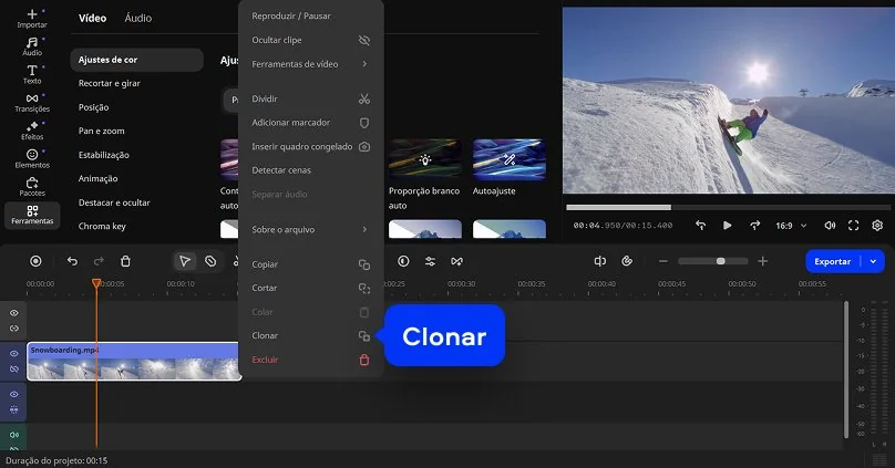Selecione o vídeo e use os comandos Ctrl+C e Ctrl+V para duplicar o elemento na linha do tempo. Alternativamente, clique com o botão direito no clipe e escolha a opção Clonar para criar cópias.
