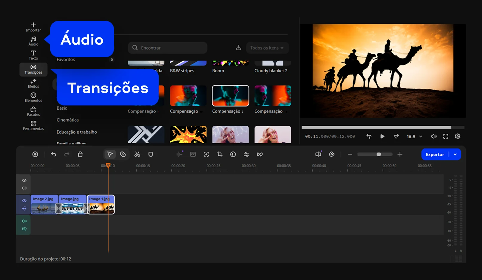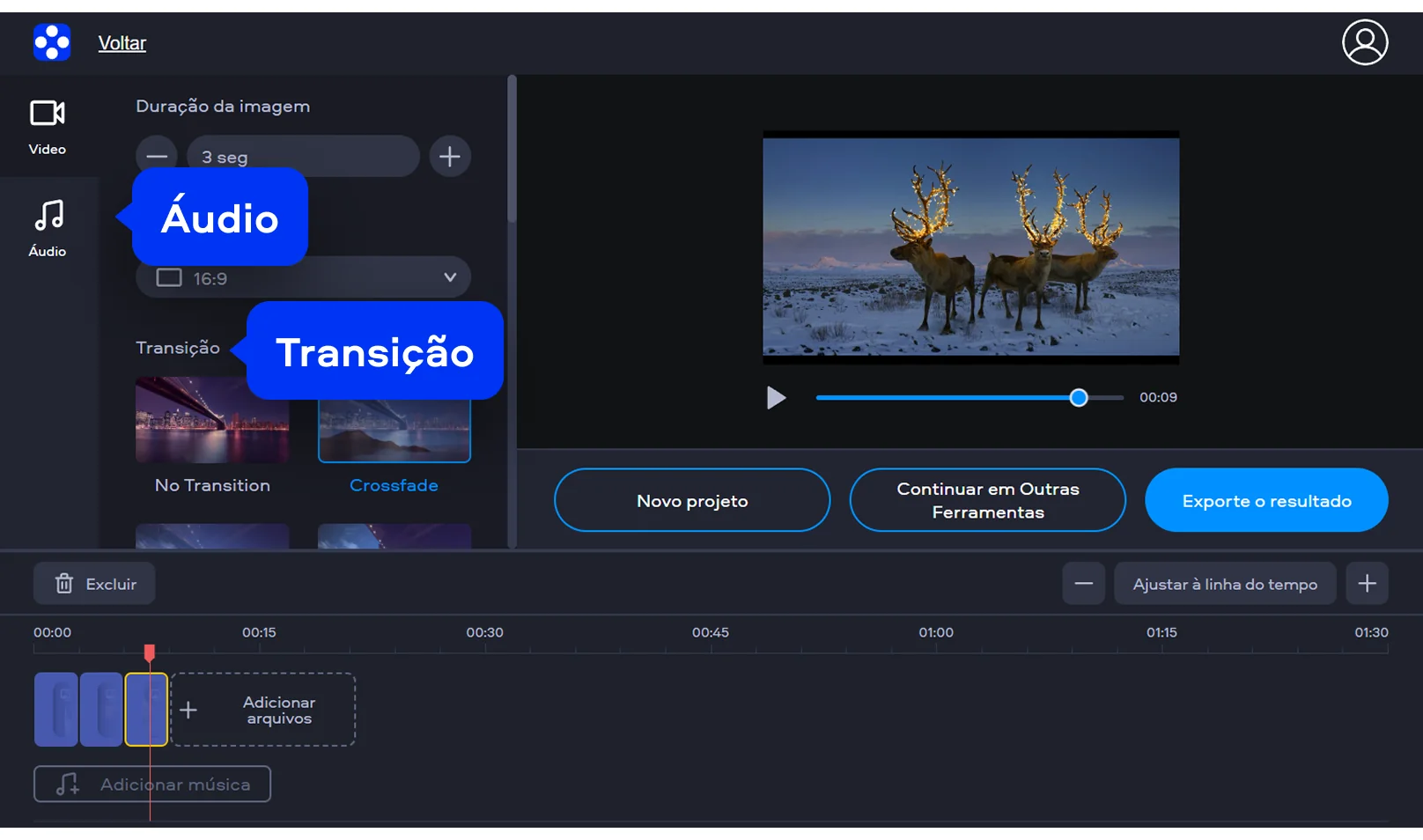 Defina a duração da imagem para controlar quanto tempo cada foto aparece. Escolha a proporção ideal para redes sociais. Adicione transição entre as imagens para um efeito mais suave. Você também pode ajustar a linha de tempo para organizar melhor o fluxo do vídeo. Se quiser, adicione música usando a biblioteca integrada e criar vídeo com fotos e música de forma simples.