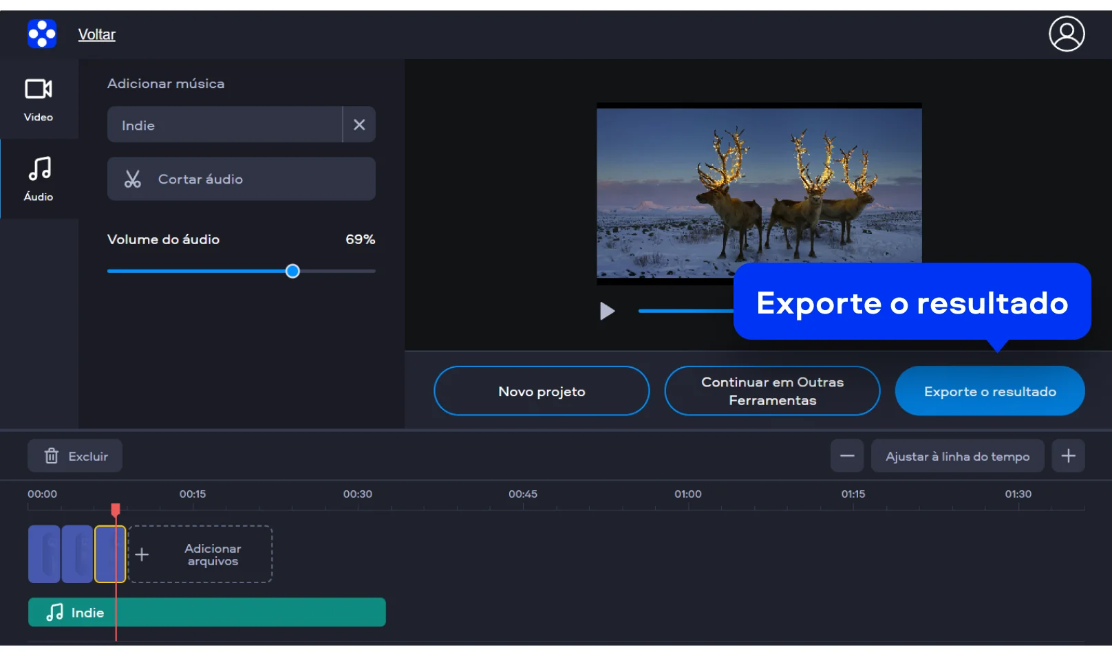 Quando estiver satisfeito, finalize o projeto e exporte. Em poucos segundos, você terá um vídeo pronto para compartilhar. Assim, fica fácil montar vídeo com fotos grátis sem precisar de ferramentas complexas.