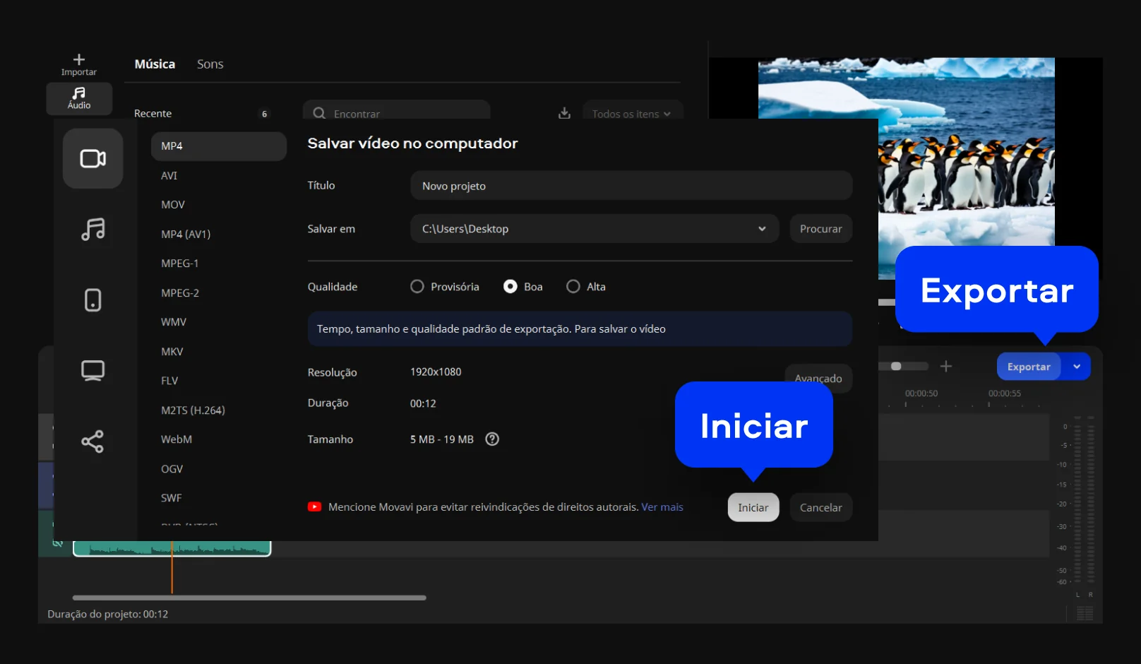 Quando tudo estiver pronto, clique em Exportar. Escolha o formato e a qualidade do arquivo. Depois, clique em Iniciar para salvar. O resultado final mantém qualidade e permite fazer vídeo com fotos pronto para qualquer plataforma.