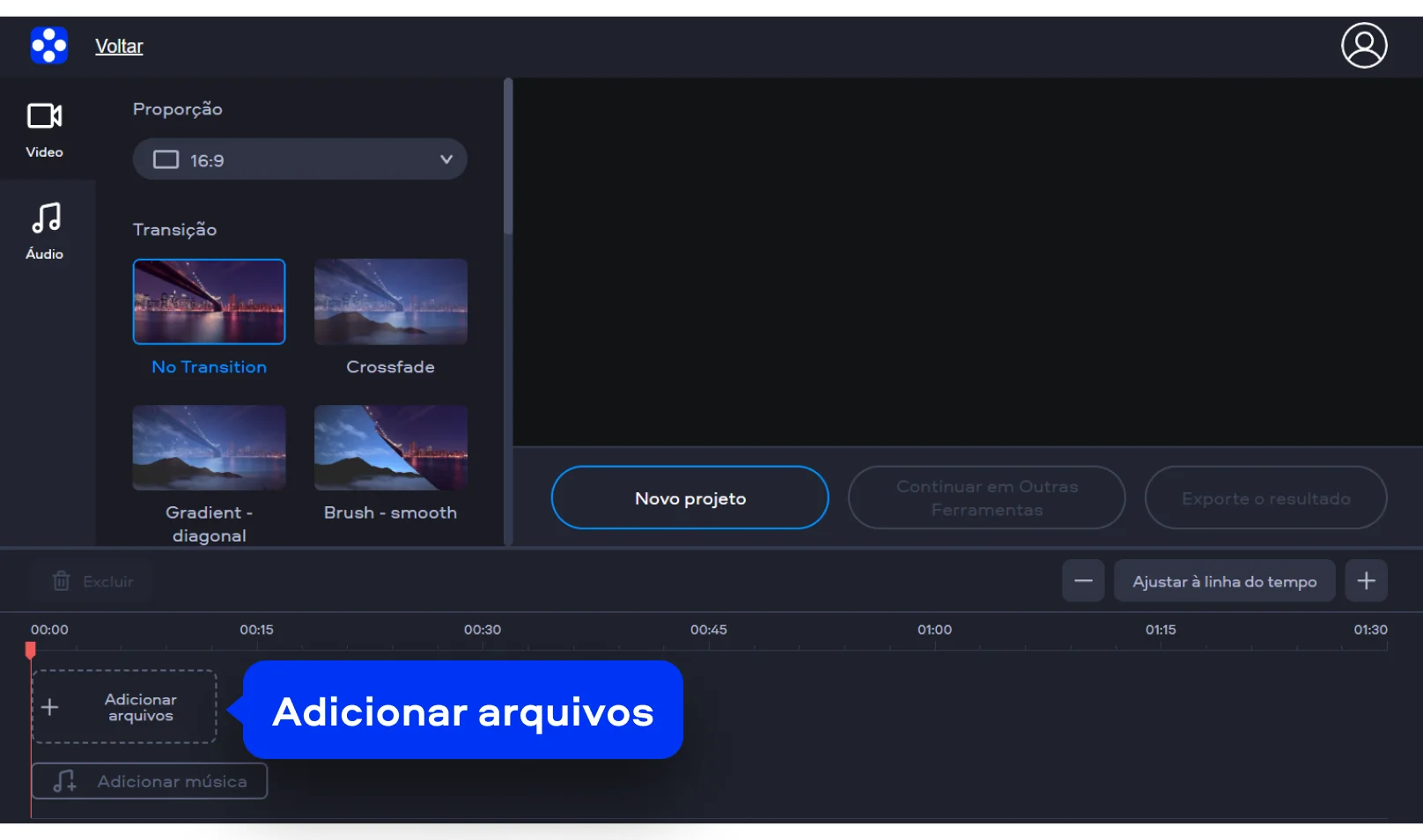 Clique em Adicionar arquivos e selecione as fotos do seu dispositivo. Elas serão carregadas automaticamente na linha de tempo. Você já pode começar a organizar seu vídeo com fotos na ordem que preferir.