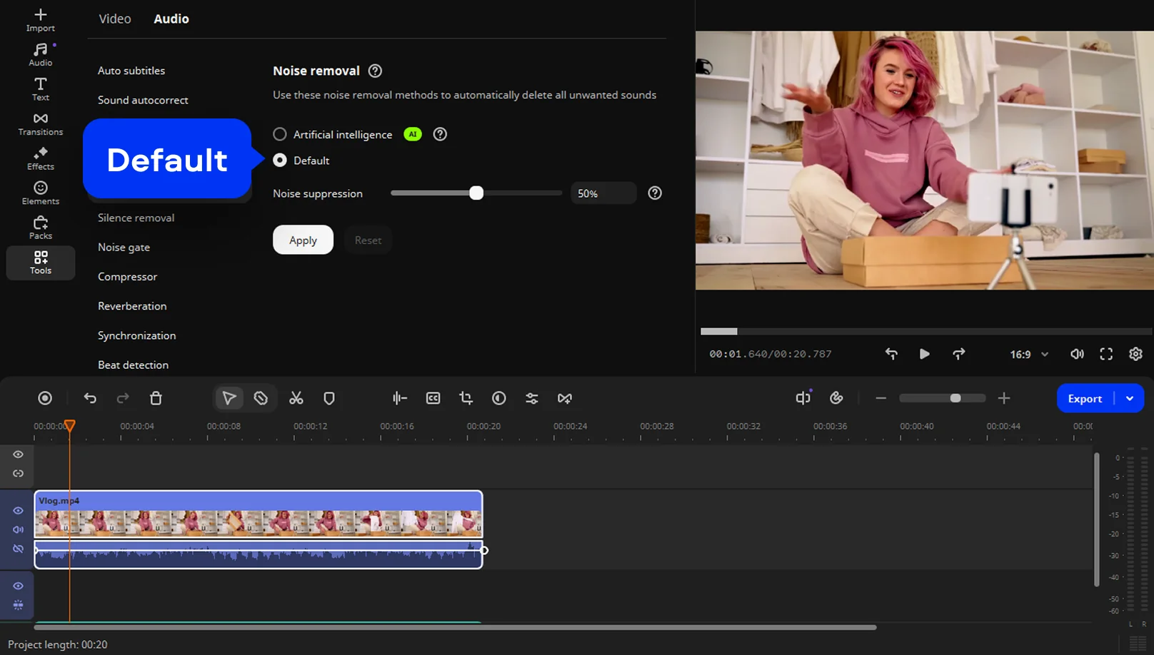 You can remove noise automatically – just select the AI option from the menu. To remove noise manually, choose Default and move the Noise suppression slider.