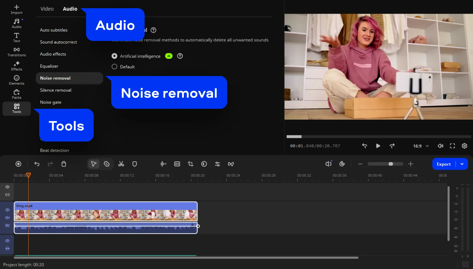 Open Tools > Audio and select Noise removal. This is where background noise removal begins, quietly working to sharpen clarity while keeping speech intact.