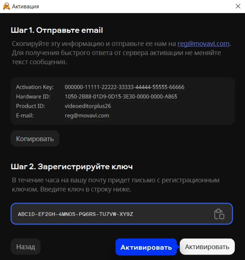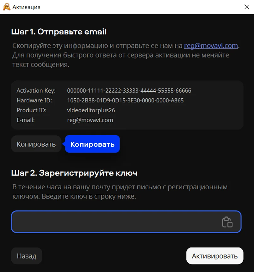 Большинство программ Movavi имеют две версии: для Windows и macOS. Проверьте, что в письме правильно указана операционная система вашего компьютера. В противном случае обратитесь в службу техподдержки. - При офлайн-активации убедитесь, что вы вставили ключ активации и регистрационный ключ в правильные поля.
