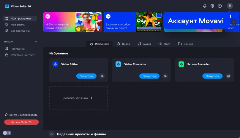 Активировать Movavi Video Suite можно тремя способами: с помощью входа в свой аккаунт Movavi; ключом активации в Video Suite; в одной из программ, которая входит в Video Suite.