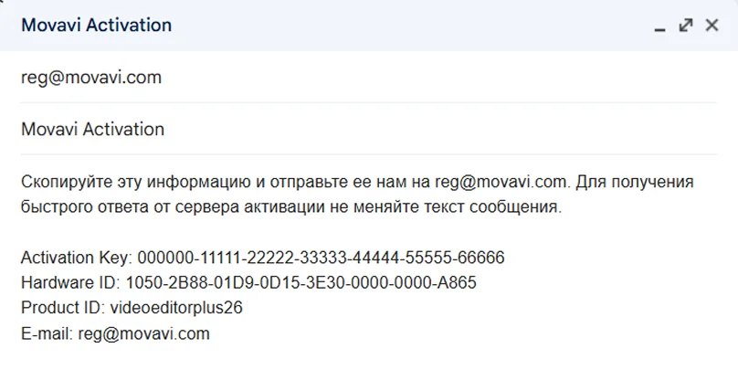 На устройстве, у которого есть доступ в Интернет, создайте новое письмо. В поле для текста письма вставьте информацию из диалога активации. Затем отправьте созданное письмо на адрес reg@movavi.com.