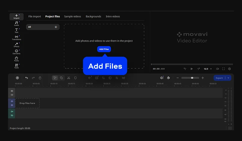 Click Add Files and select your video. Then drag and drop the file on the timeline.