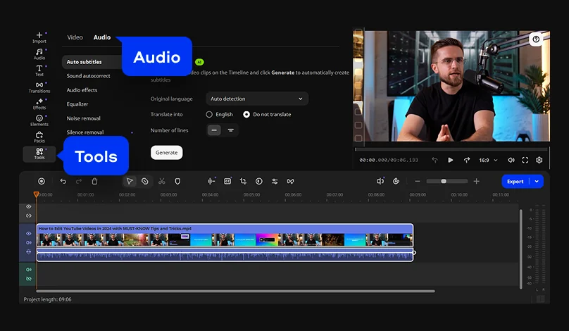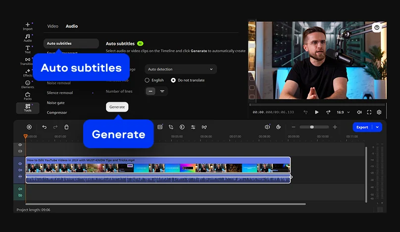 The language of your video can be detected automatically. Alternatively, you can set the language manually by choosing the appropriate option from the Clip language drop-down list. Hit the Generate button and wait until the subtitles generation process is complete.