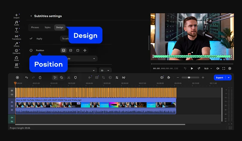 On the Design tab, you’ll find various settings to customize your subtitles. Place the subtitles anywhere you want on the video – use the options Bottom, Center, and Top, or adjust the position manually.