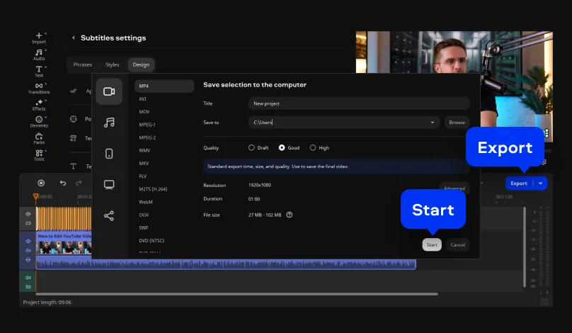 Great! Now, it’s time to save the video. Hit the Export button, adjust the output settings, and click Start.