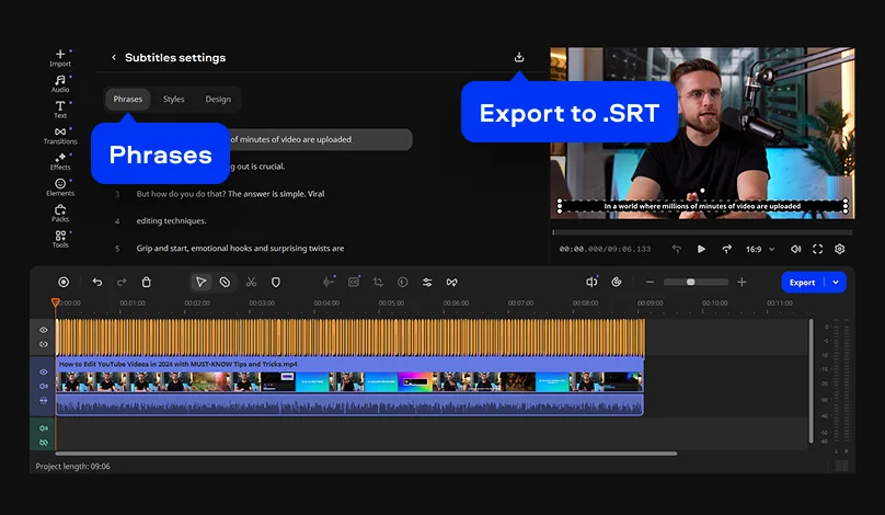 When the subtitles are ready, you’ll see all the lines on the Phrases tab. You can edit the text if you need.