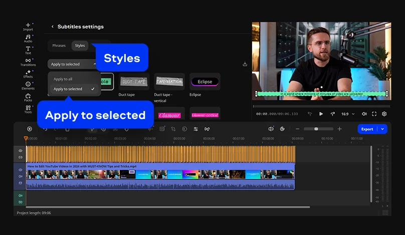 Open the Styles tab and select the design for your captions. There are more than 30 styles available to perfectly match any type of video content you create. The selected design will be applied to all clips by default. If you want to set different styles for clips, select your clip on the timeline and choose Apply to selected from the drop-down menu.
