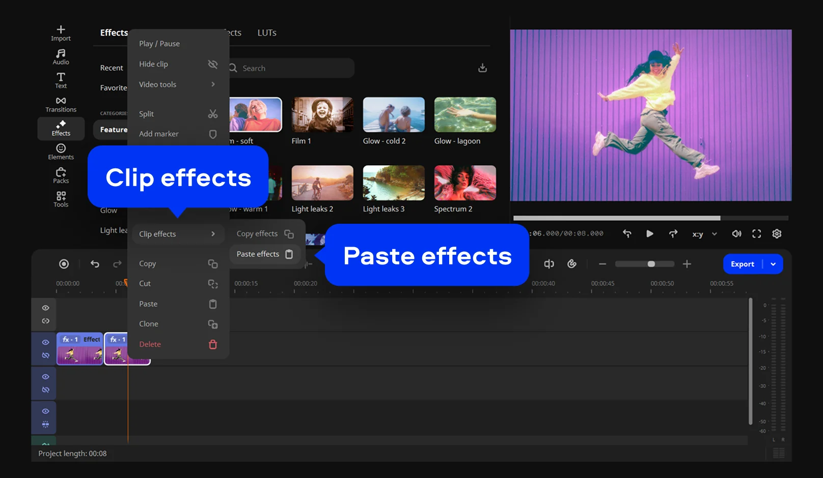Now, pick the clip you want to apply the effect to, right-click again, open Clip effects, and click Paste effects to add it instantly.