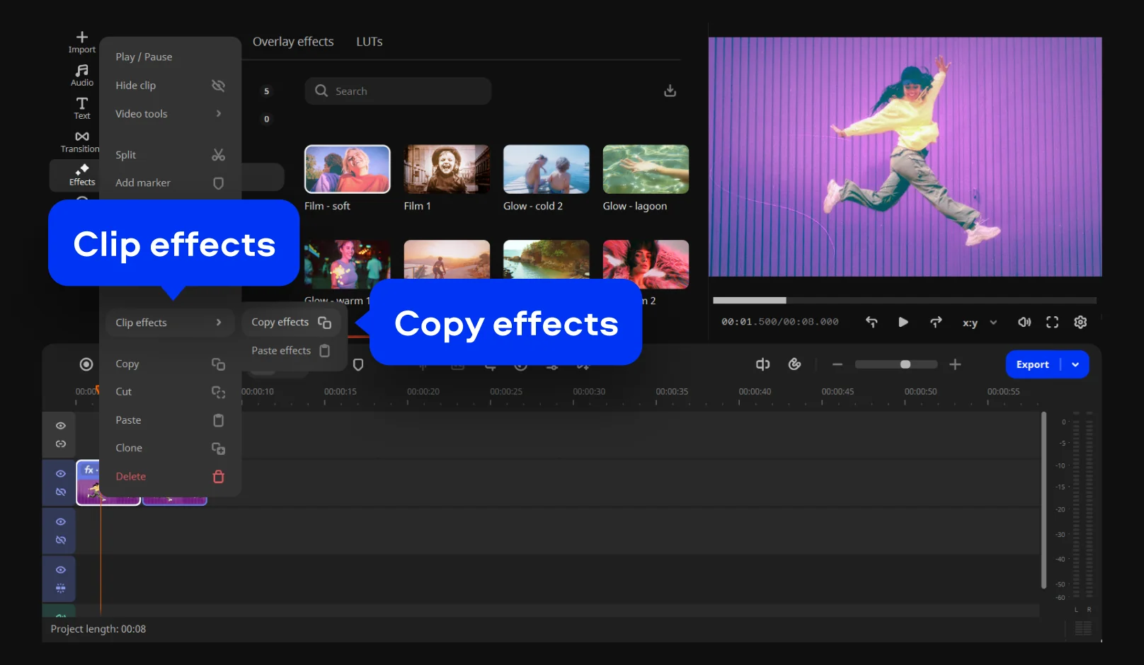 Select the clip that includes an effect you want to apply to another video. Right-click it on the timeline, go to Clip effects, and choose Copy effects.