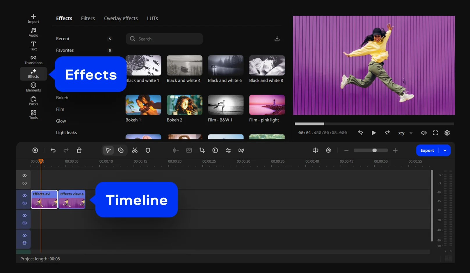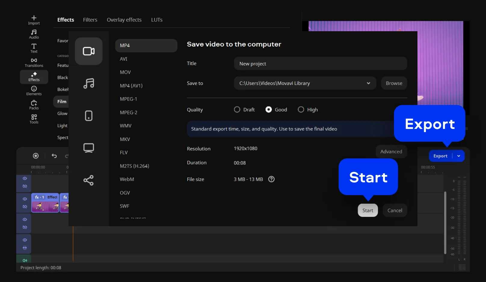 Make standout edits in minutes thanks to ready-to-use video ideas and awesome effects – all available right inside Movavi Video Editor