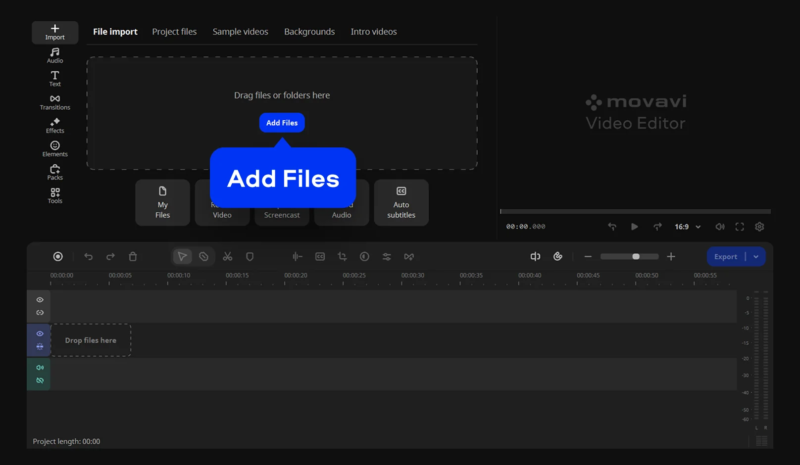 Click Add Files and select your videos. Then move the imported videos onto the timeline.