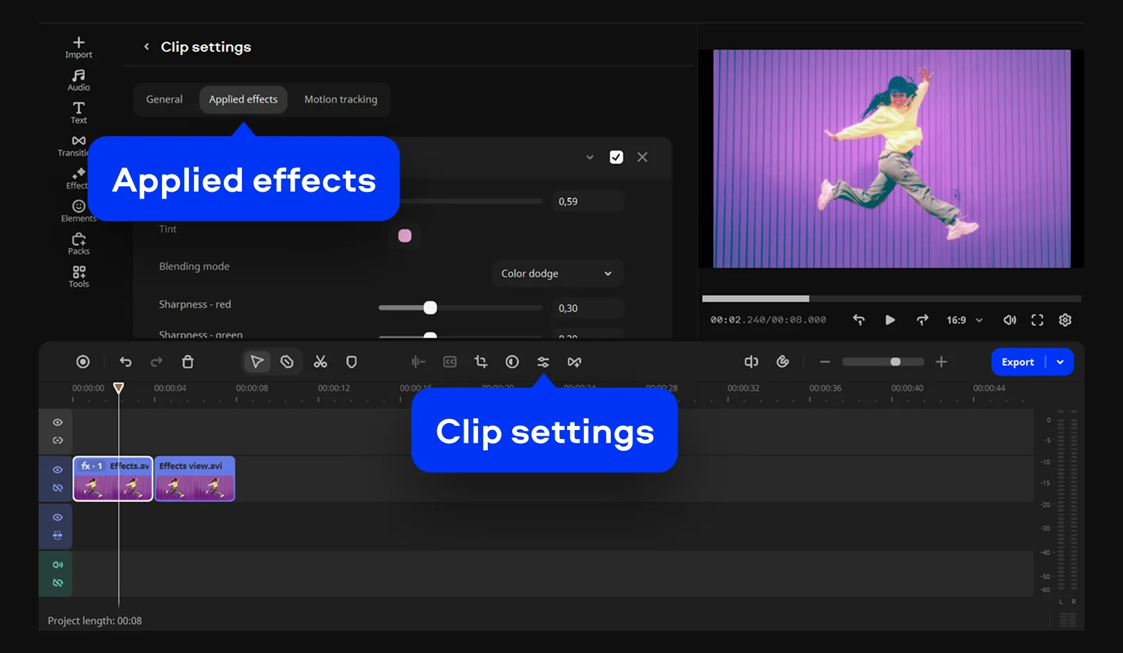 To modify the effects, click Clip settings and choose Applied effects. Here, you’ll see a panel with all the applied effects – you can edit each one separately. Use sliders and scroll through the drop-down menus to adjust Intensity, Sharpness, Opacity, Tint, Blending mode, Grain, and other options, depending on the selected effect.