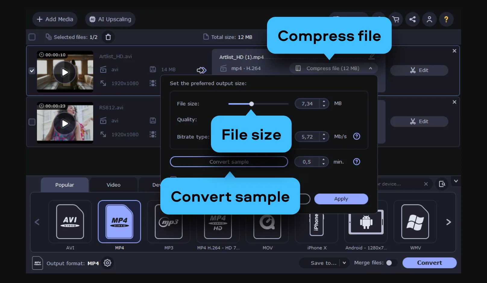 Return to the main program window and click Compress file. Select the target file size using the File size slider. The quality and bitrate will be adjusted automatically. You can also click Convert sample to preview how the file will look after conversion.