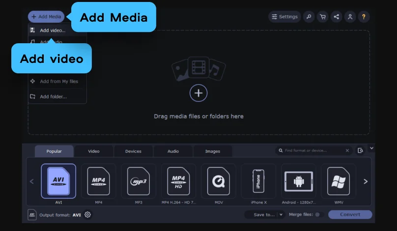 Use our online AVI converter for quick conversions. For larger files and batch conversions, try Movavi Video Converter.