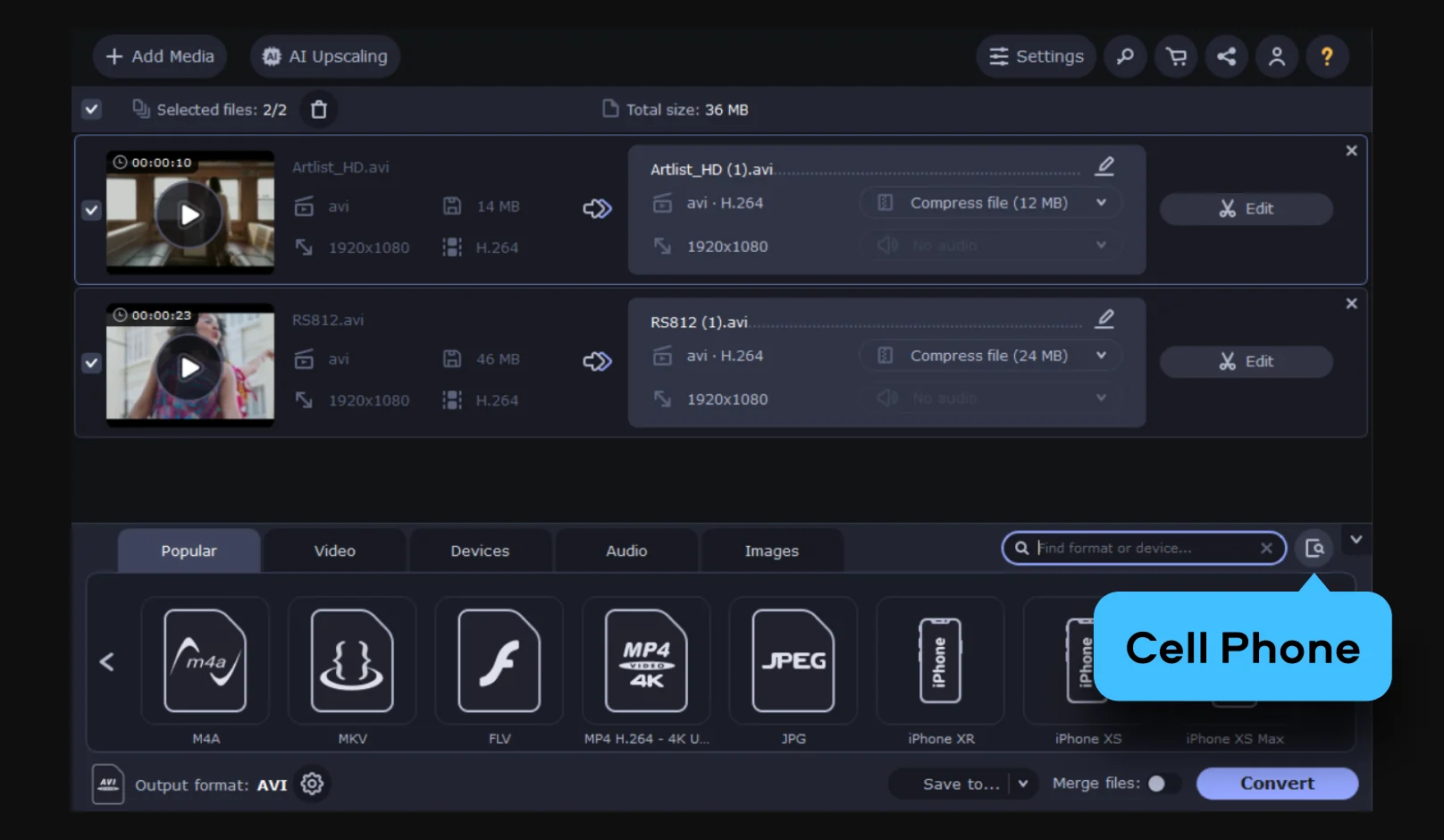 Select the required format or mobile device to ensure the correct properties are used for the output file. Alternatively, you can connect your device to your computer and click the Cell Phone icon to the right of the search bar – the program will automatically detect your device and suggest a suitable preset.