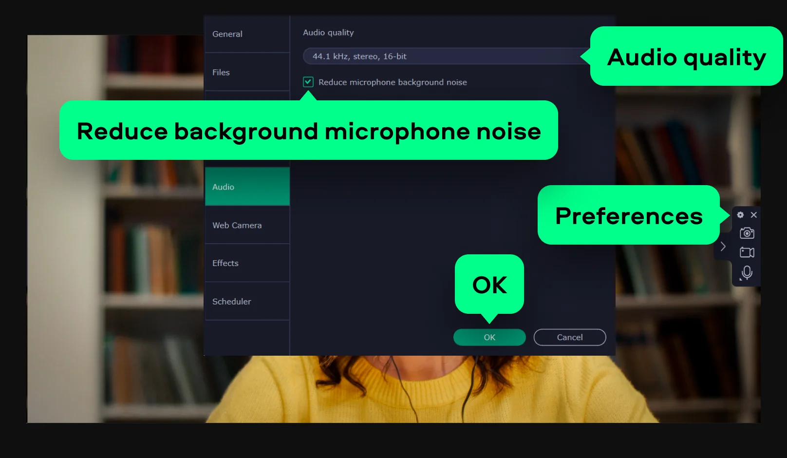 Click Preferences, then select Audio in the pop-up window. Choose the preferred Audio quality from the dropdown list. You can also Reduce background microphone noise – just tick the corresponding checkbox. Then click OK.