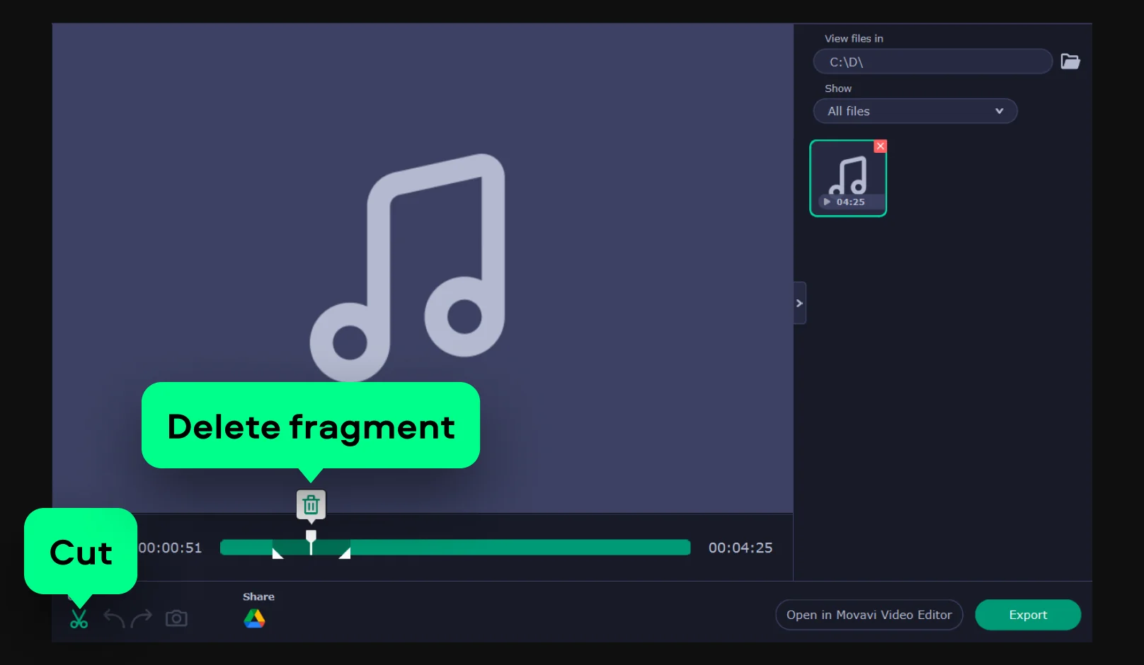 After finishing the recording, you can trim the audio and remove any unwanted parts. Place the cursor where you want to split the track and click Cut. Then select the segment you want to remove and click Delete fragment. Now your audio is ready for export.