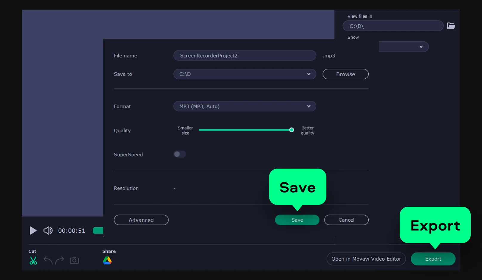 Click Export, then click Save – your MP3 audio file will be saved to your computer!