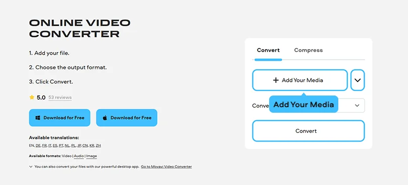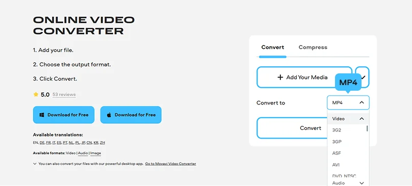 When you don't know how to convert AVI to MP4, there is one great choice that is never wrong. Movavi Video Converter is a free, feature-rich app that handles converting AVI to MP4 on Mac with superior ease. It supports batch processing, has more than 180 media formats (AVI, MP4, MKV, and you name it), includes editing tools like trim, crop, filters, and offers AI video upscaling. What I especially like is that it also offers lossless compression and presets for devices like iPhone, iPad, etc. It works on macOS 10.13 or higher.