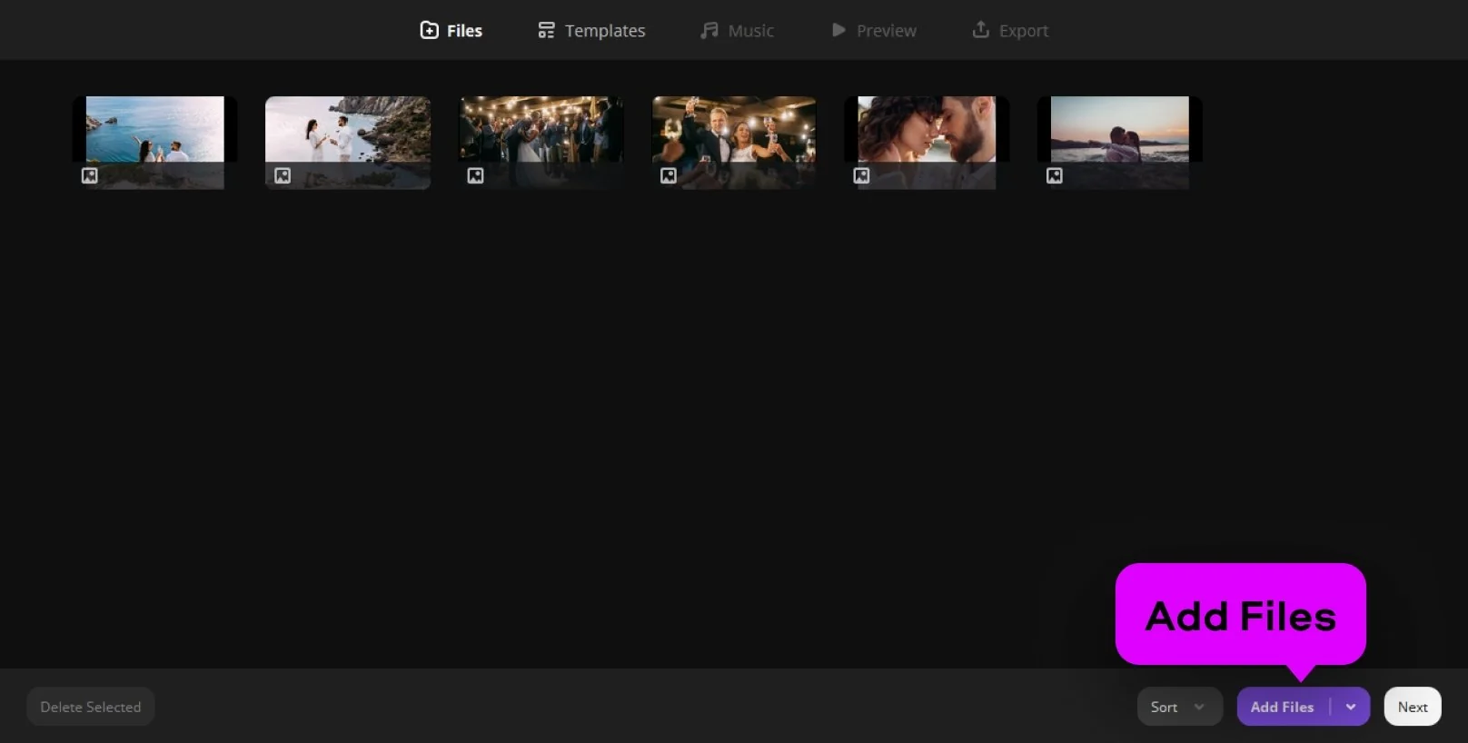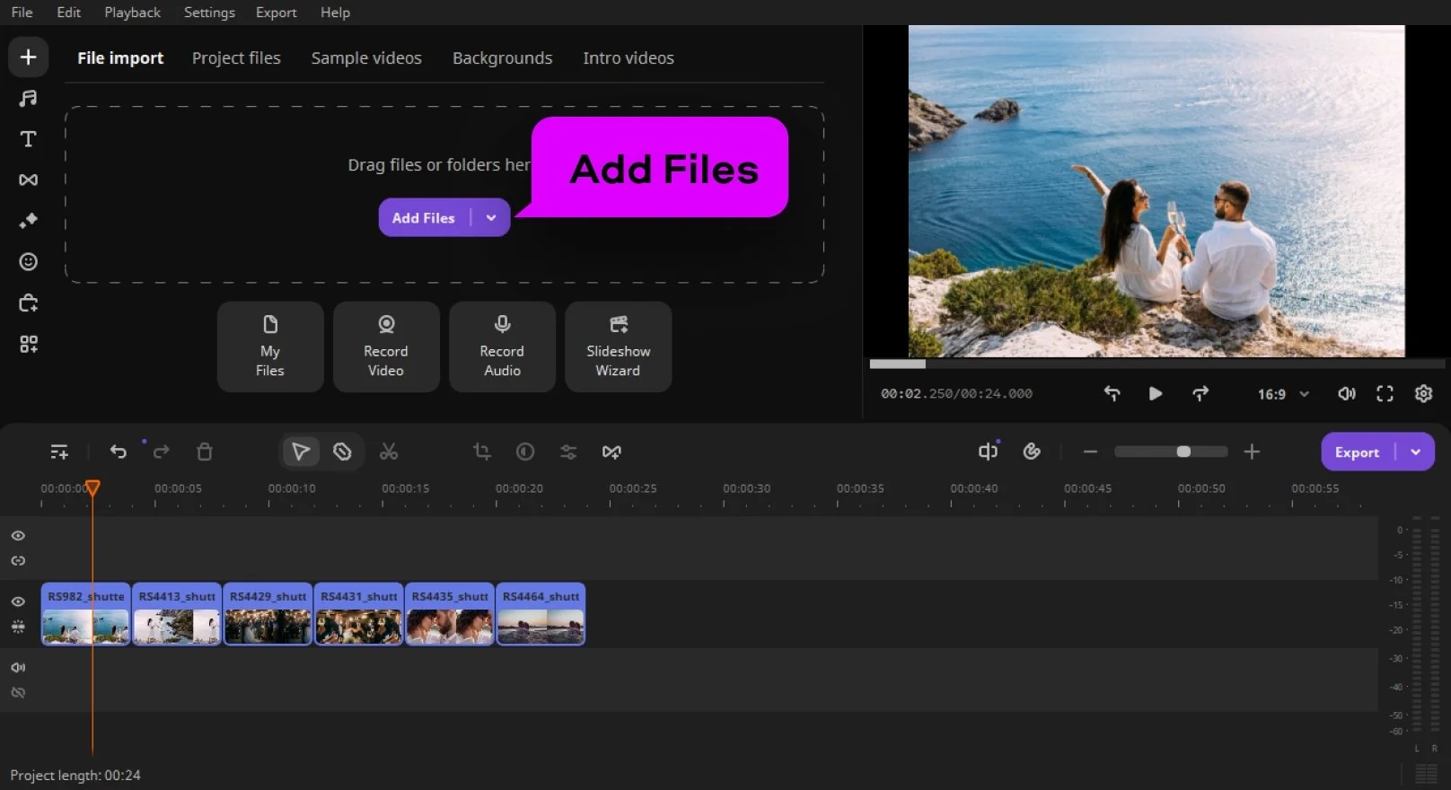 Choose your photos and videos and add them to the timeline all at once by clicking the Add Files button, no matter how many pictures you have and how long your videos are.