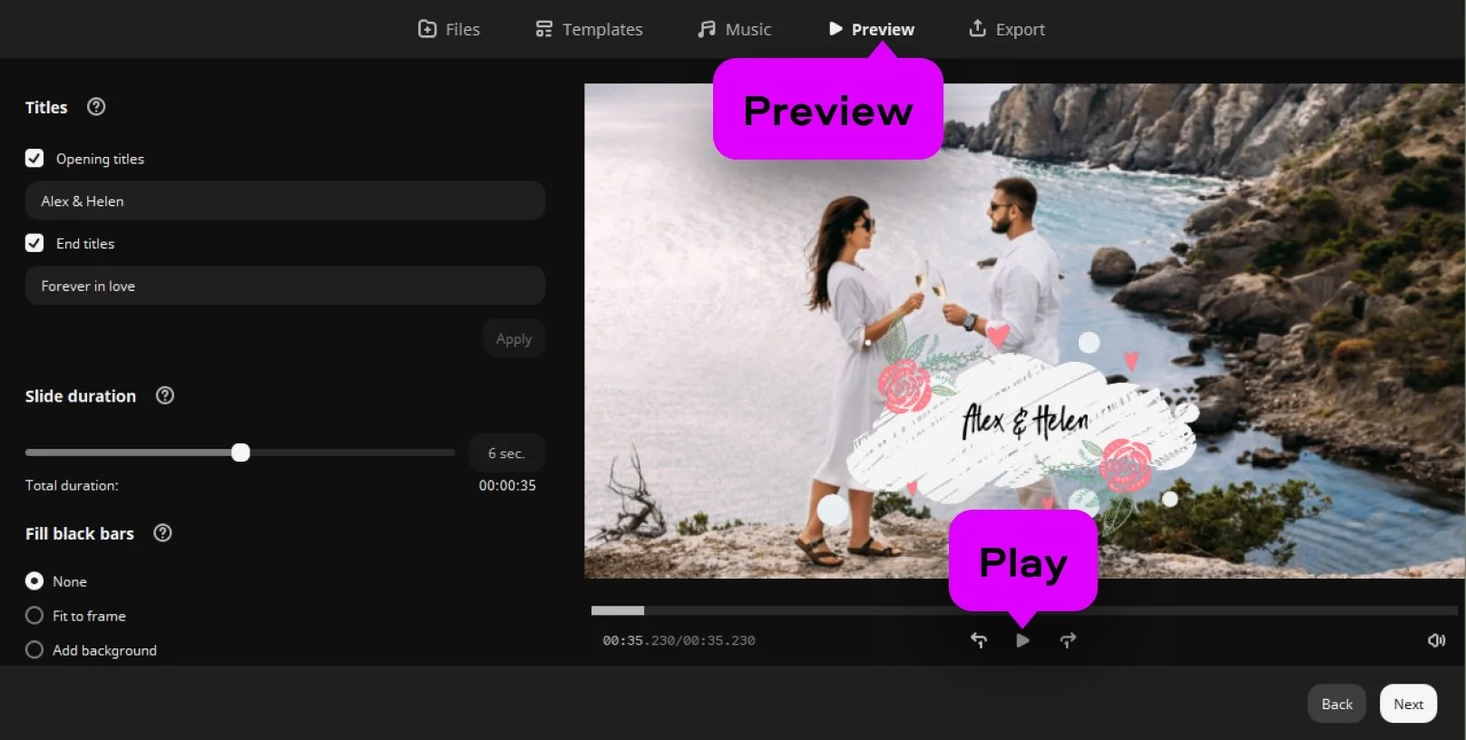 At this point, you can make your final edits in Slideshow Wizard mode. Type your own unique text, like quotes and personal wishes, for your opening and closing titles by clicking the Preview tab, choose from a variety of caption styles. You can also adjust the length of your slideshow to the length of the soundtrack and remove any black sidebars from photos and videos. Preview your wedding slideshow by clicking the Play button.