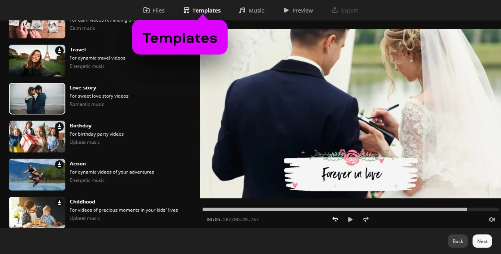 Weddings are stressful enough without adding to it with your slideshow software. Look for an intuitive interface featuring drag-and-drop editing, multiple pre-designed templates, and built-in music. If you can import your photos, pick a theme, and see the results in less than ten minutes, you're in good hands. Whether you’re learning how to make a wedding slideshow with music for the first time or you’ve done it before, ease of use makes all the difference.