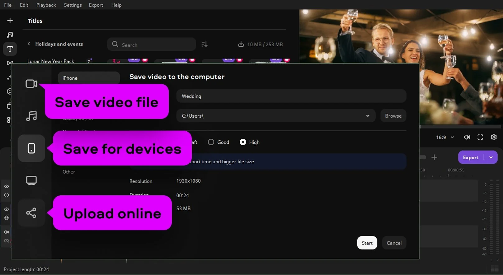 You can select the appropriate option from the tabs on the left of the export window. Choose Save video file or, for example, Save for devices to watch on your computer or mobile device, or upload to YouTube by clicking the Upload online tab. When you’re done, click Start. Now you know how to use our handy photo-to-video creator with music, titles, and transitions!