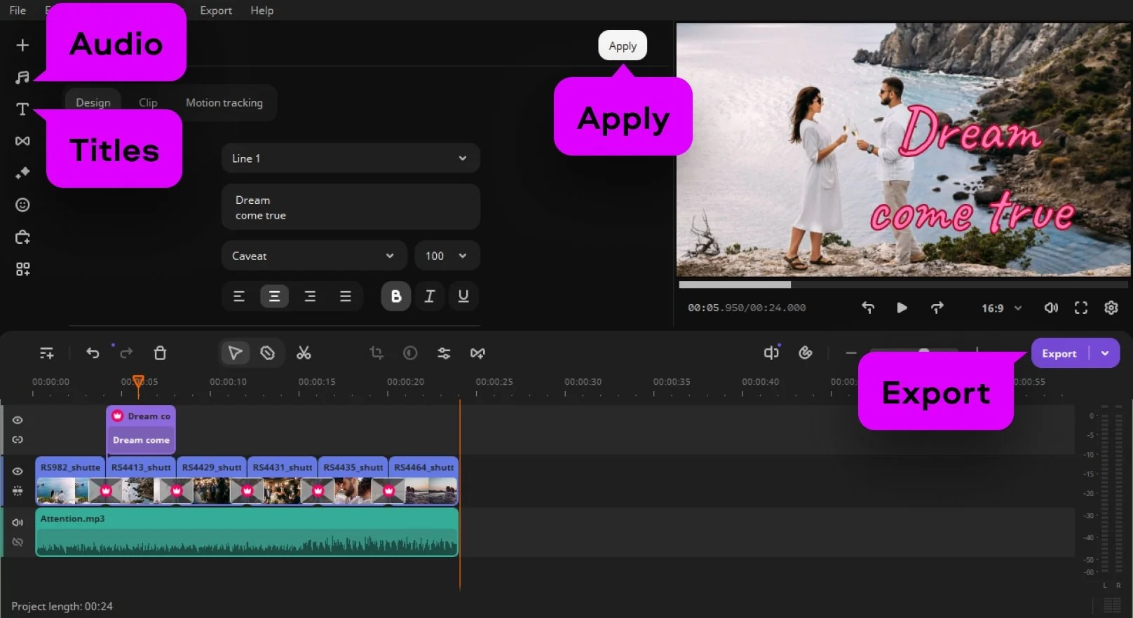 Double-click the titles on the timeline to edit them. You can write your own unique text, like quotes and personal wishes, and specify parameters like font, size, and color in the Preview Area. To save the changes, click Apply.