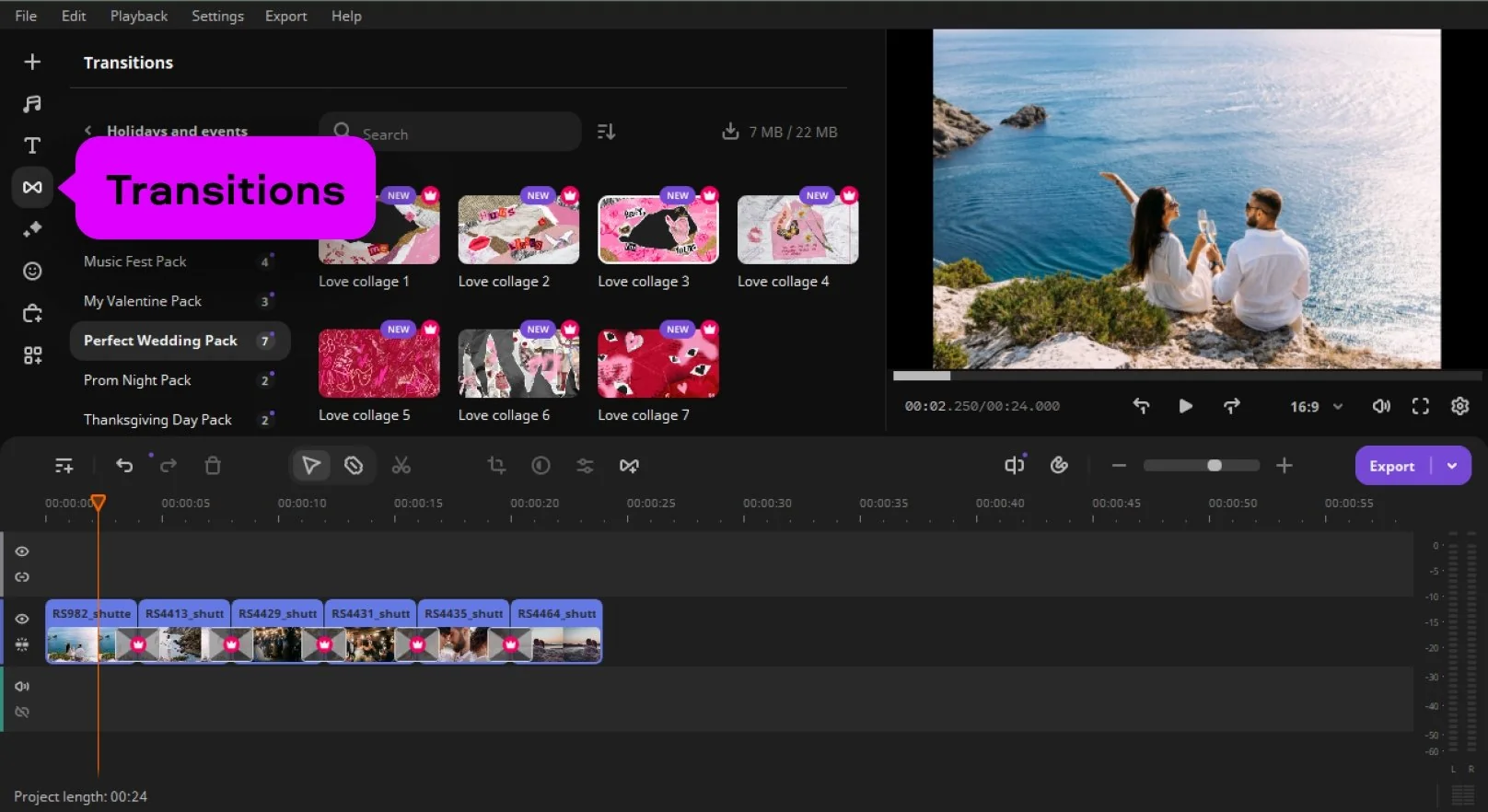 Make your movie flow smoothly – go to the Transitions tab, choose from thematic categories, and select the transitions you like the best.