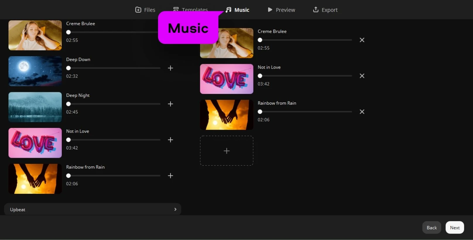 Spice up your wedding reception movie with music. You can drag and drop your music files into the working area, or click Add Files in the Music tab to choose and import them. Add a song that has special meaning for the couple or choose from a music library with a wide range of ready-to-use music tracks.