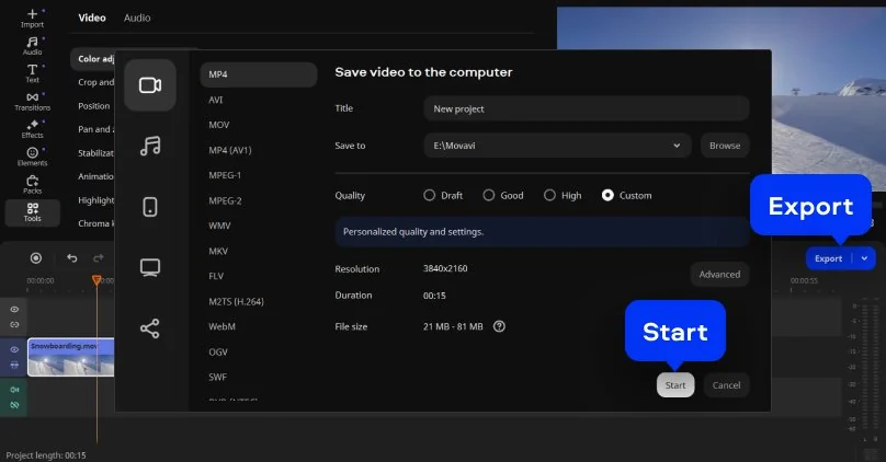 Looking for an app to edit 4K videos without slowing down your workflow? Movavi Video Editor lets you create an HD video and work with it smoothly, keeping every detail sharp.