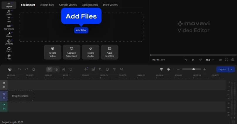 - First, download and install Movavi Video Editor on your PC and open the program. Then click Add Files to and select the 4K video you want to import into the timeline.