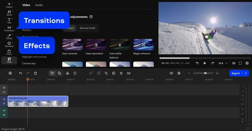Select your clip on the Timeline and start trimming unnecessary parts. Rearrange scenes, split clips, and fine-tune the pacing. Use color adjustment tools to balance exposure and improve the look of your footage. You can also add filters, transitions, titles, or stabilize shaky shots if needed.