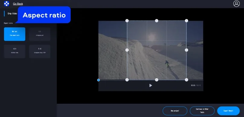 In the preview, you’ll get a resize box with corner handles and a grid, so you can tighten the composition without guessing. Pick an aspect ratio on the left – 1:1 for an Instagram post, 16:9 for YouTube, 9:16 for Stories, or keep it Not set if you want full control. This is the core of how to crop a video: drag the frame until it shows exactly what you want, then preview it with the play button.