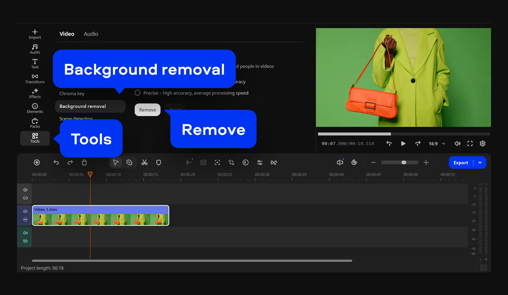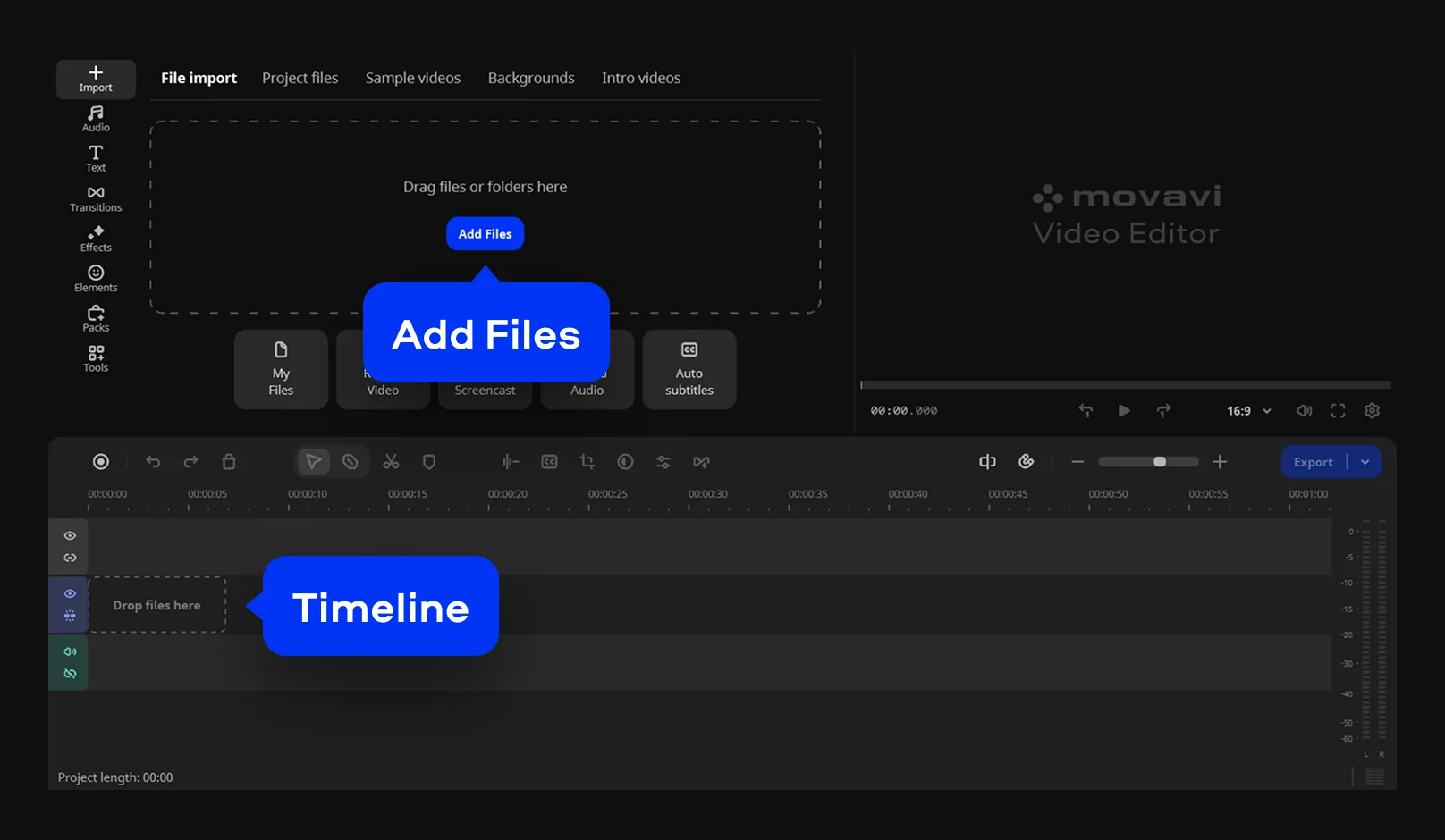 Download and install Movavi Video Editor. Open the green screen editor, click Add Files, and choose the video you want to edit. Drag the clip onto the Timeline so you can start working with it. If you already know which background you want to use, import that image or video too. It saves time and makes the next step much smoother.