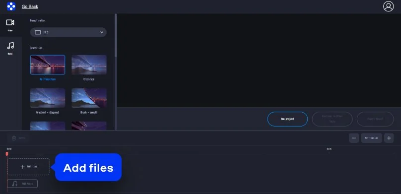 Click Add files to upload your video. Your first video drops onto the timeline at 00:00, and you can add more in the same way.